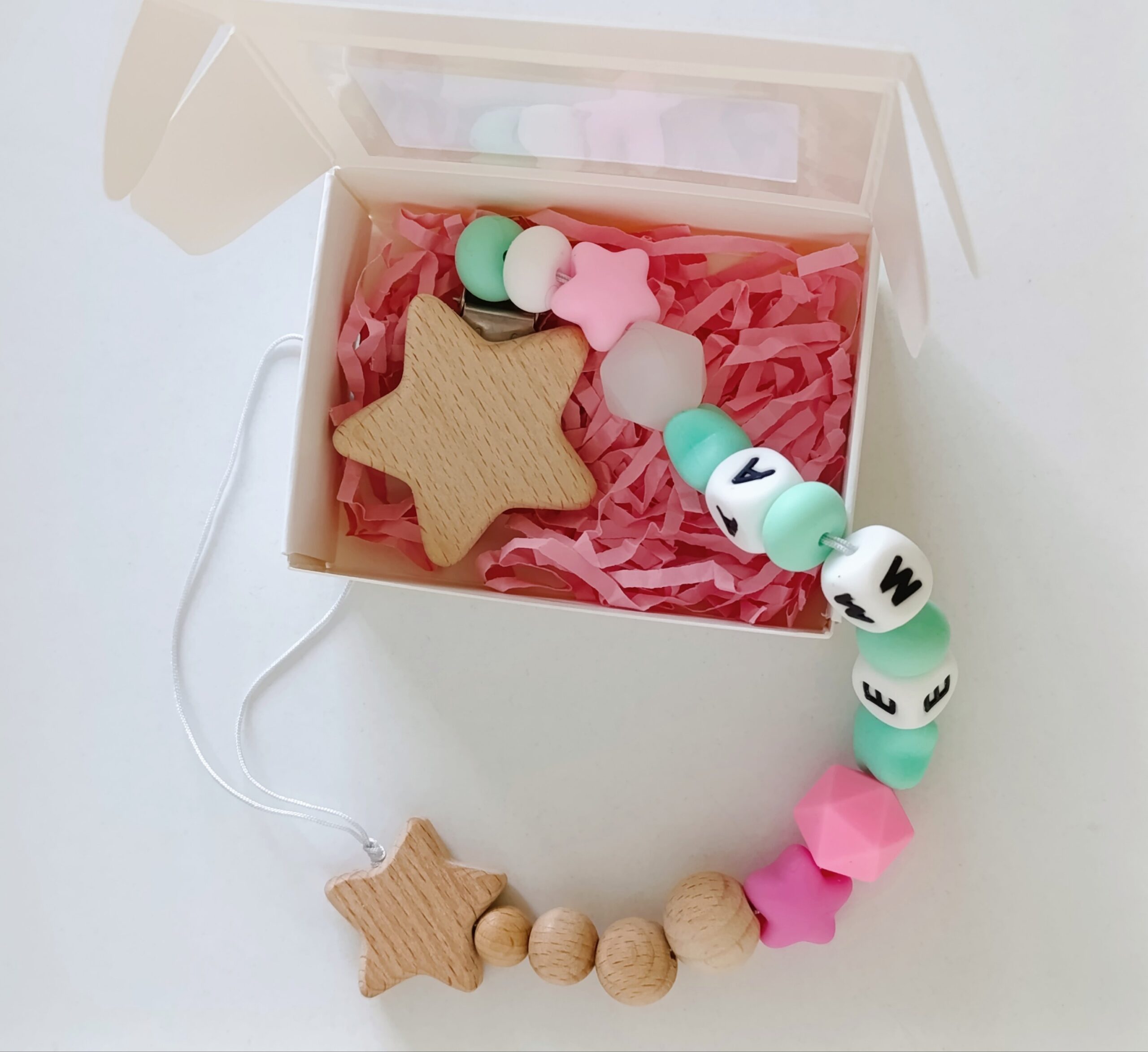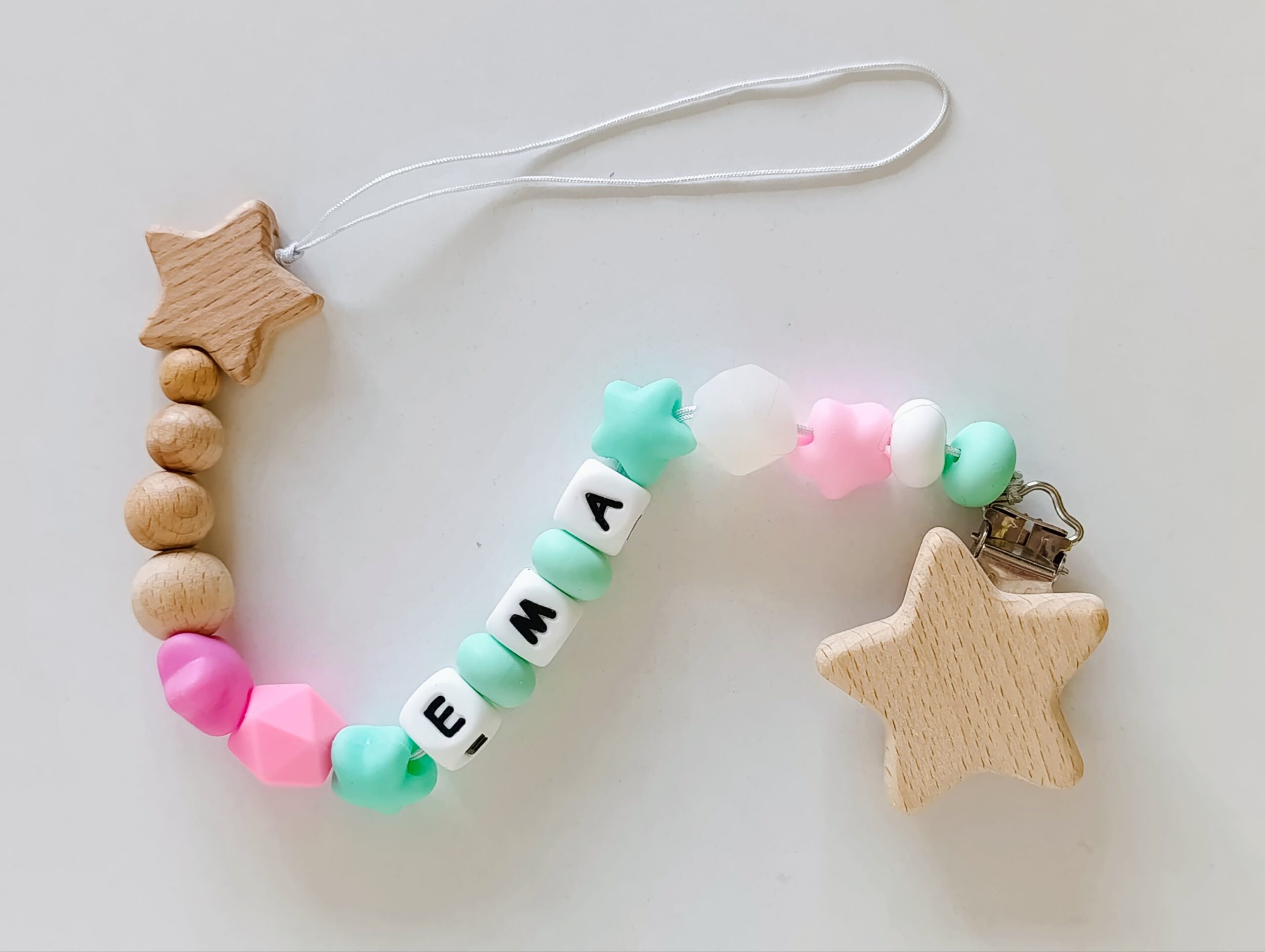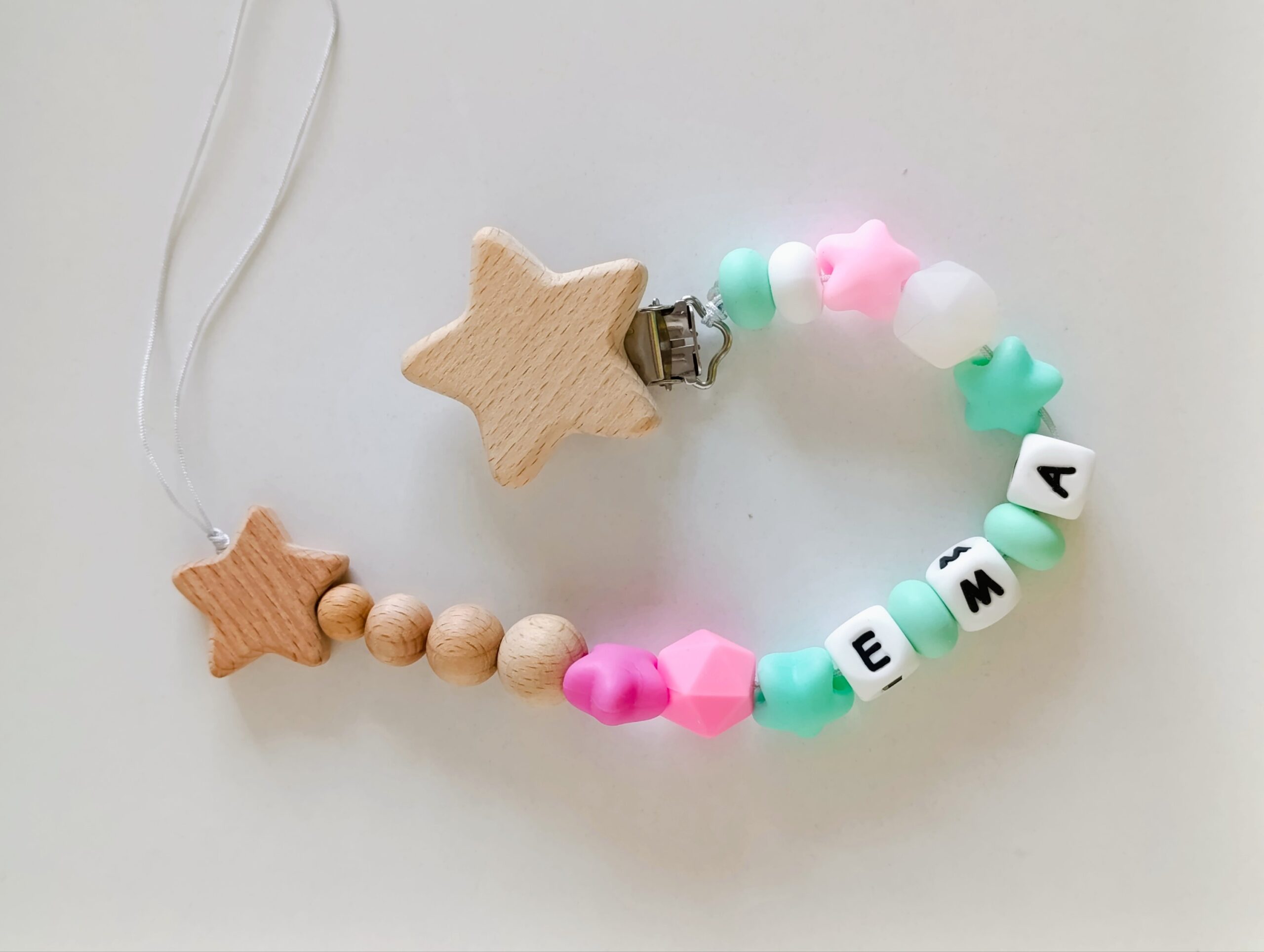 Бебешки клипс от силиконови и дървени мъниста с име по ваш избор