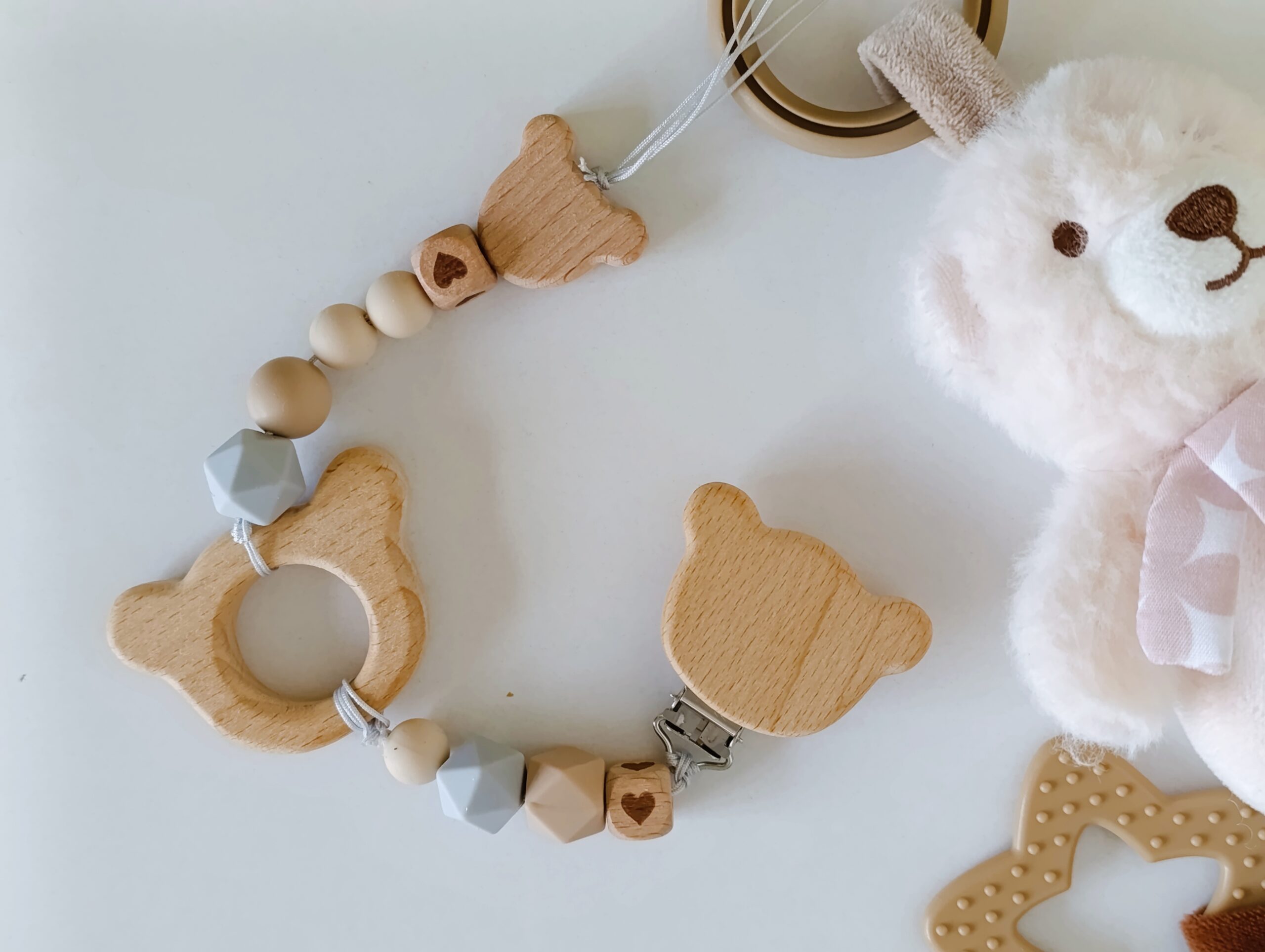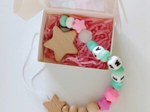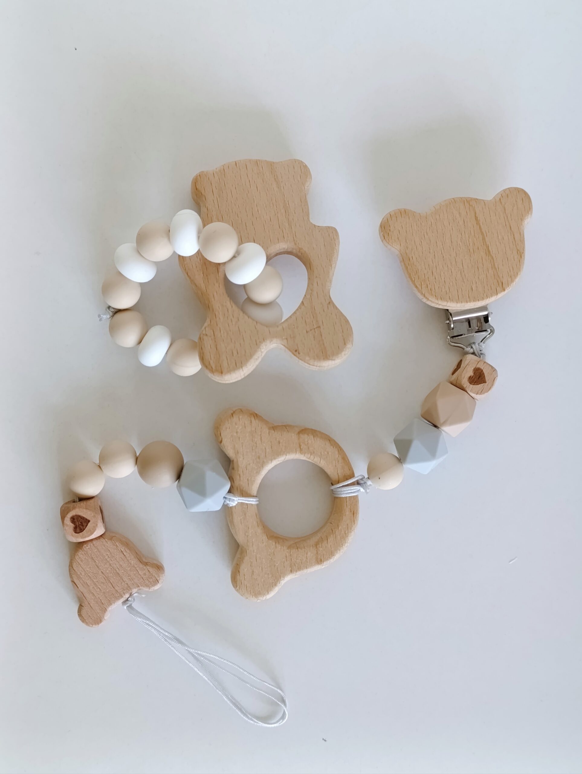 Бебешките клипсове и гризалки са изработени от висококачествени силиконови мъниста, нетоксични и подходящи за бебета, и буково дърво.