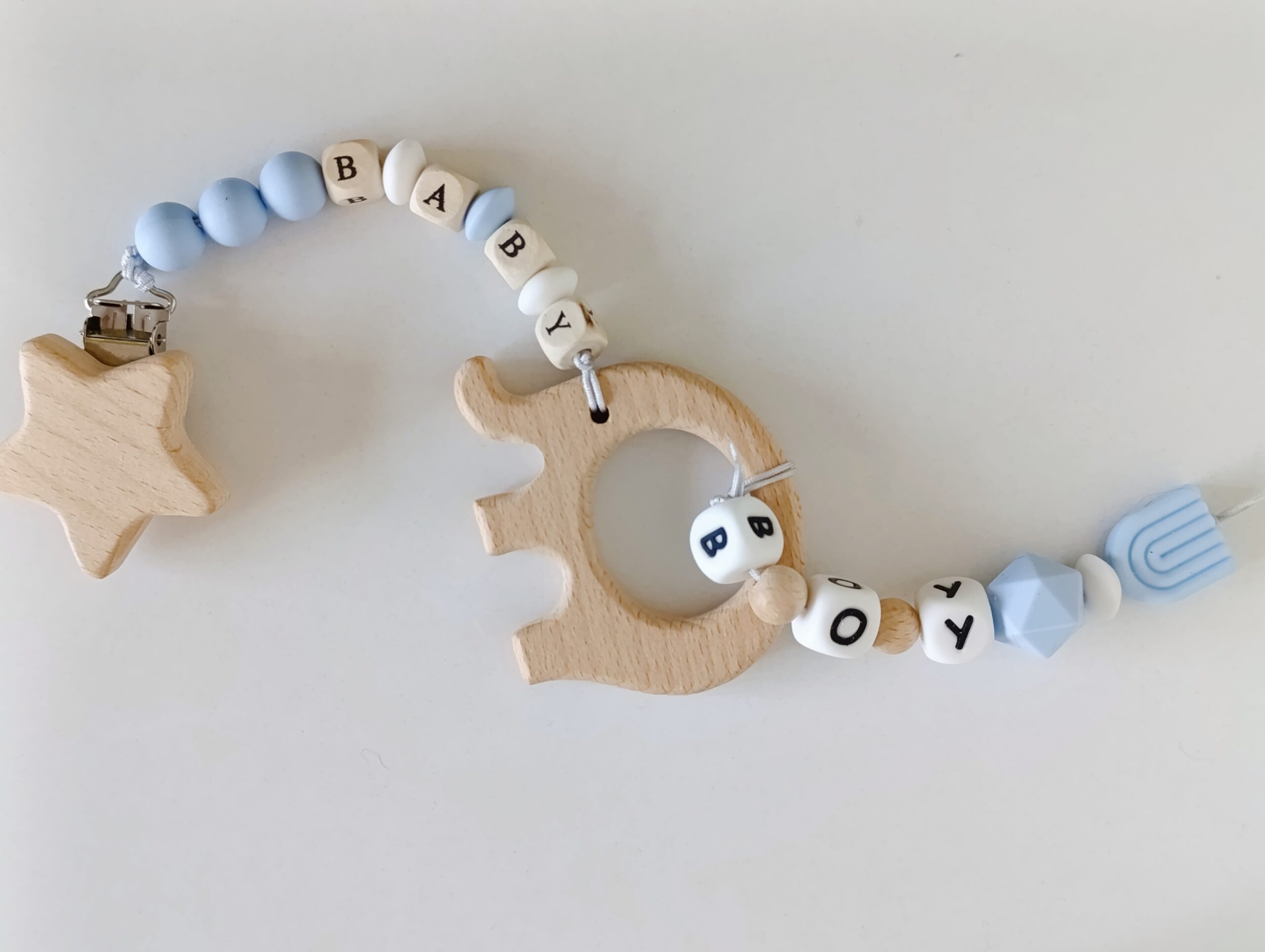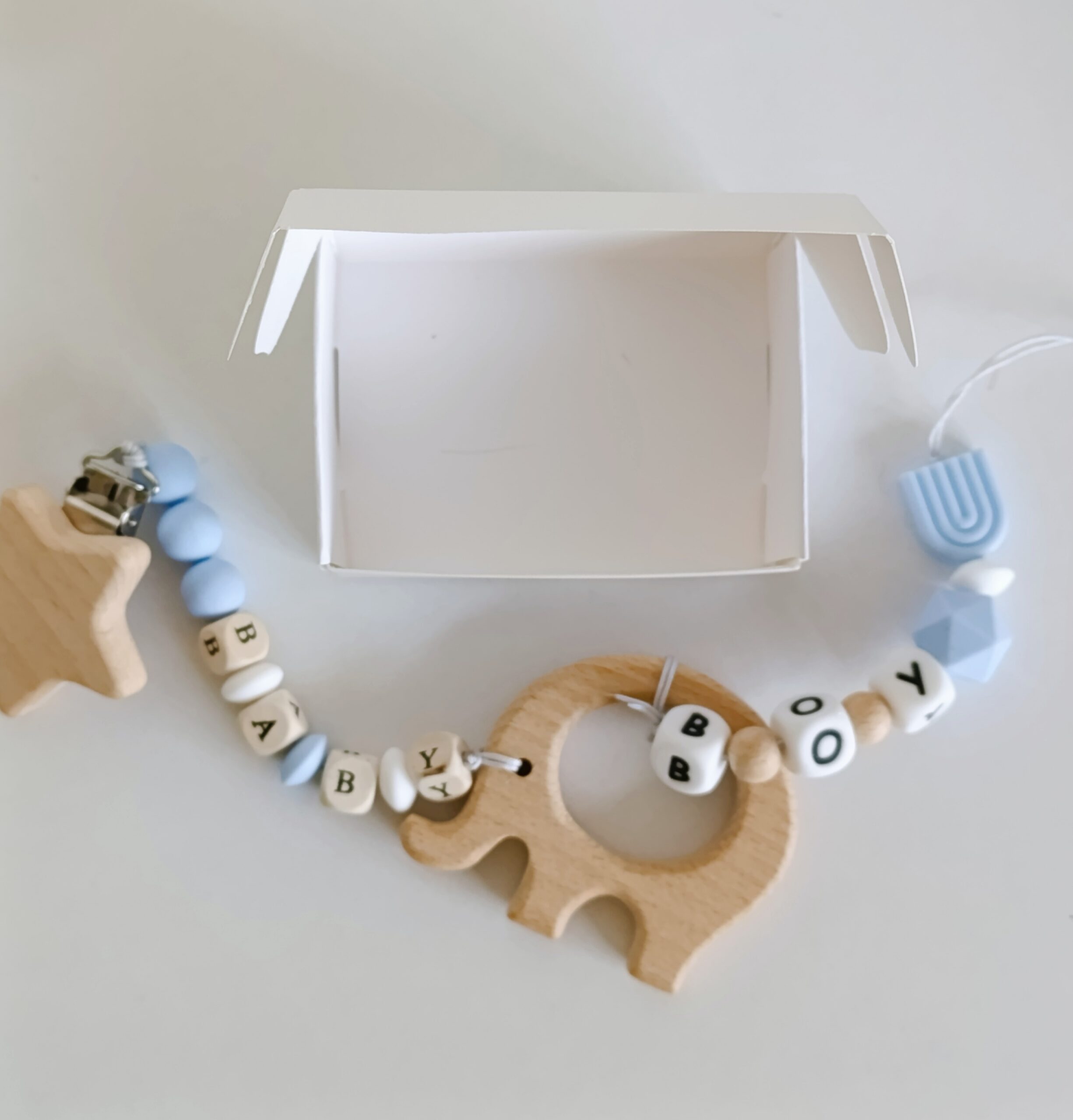 Неперсонализиран бебешки клипс+Бебешка гризалка от бебешки силикон и буково дърво